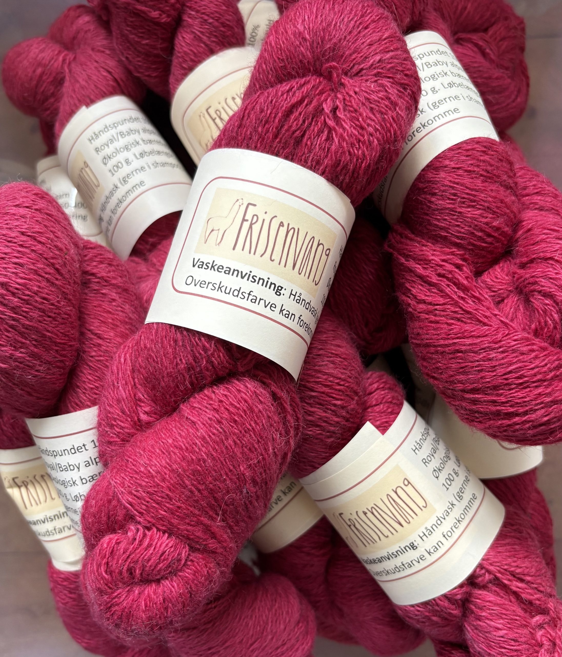 Das nachhaltige Alpakagarn von Frisenvang ist handgesponnen und besteht zu 90-95% aus Baby-Alpakawolle und zu 5-10% aus äußerstexklusiver Royal-Alpakawolle. Das Garn ist nach ökologischen Verfahren produziert und mit natürlichen Materialien gefärbt.