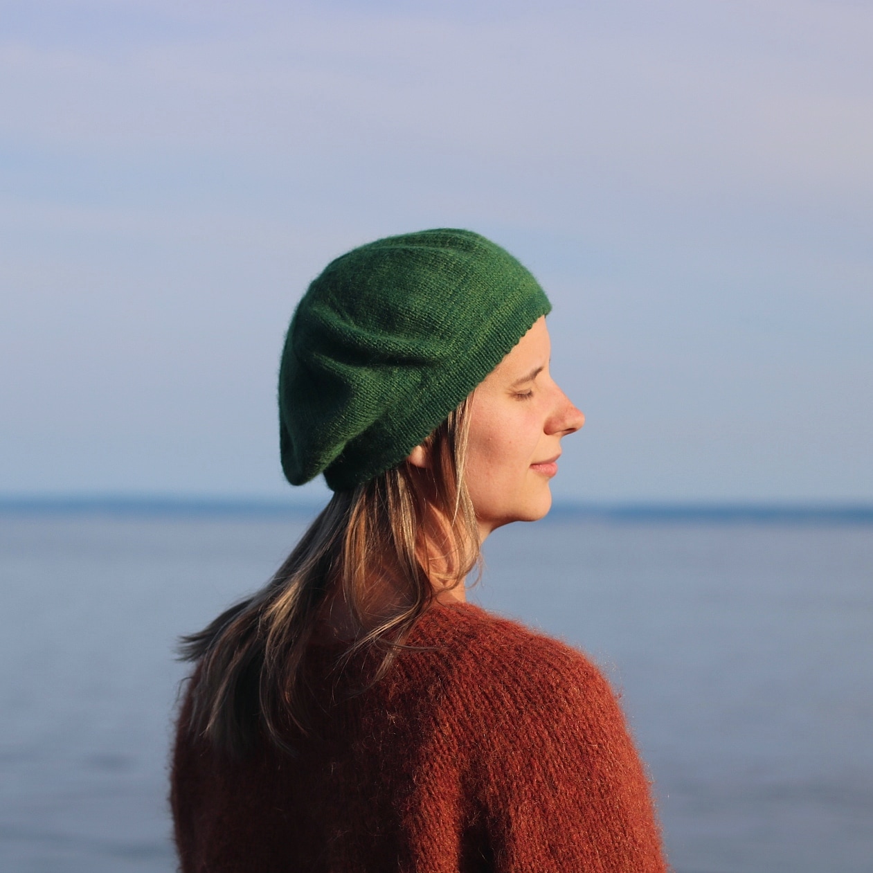 Baskerhue, design af Knittingfriend . Strikkekit med opskrift og Frisenvangs håndspundne 100% royal/baby alpaca garn.