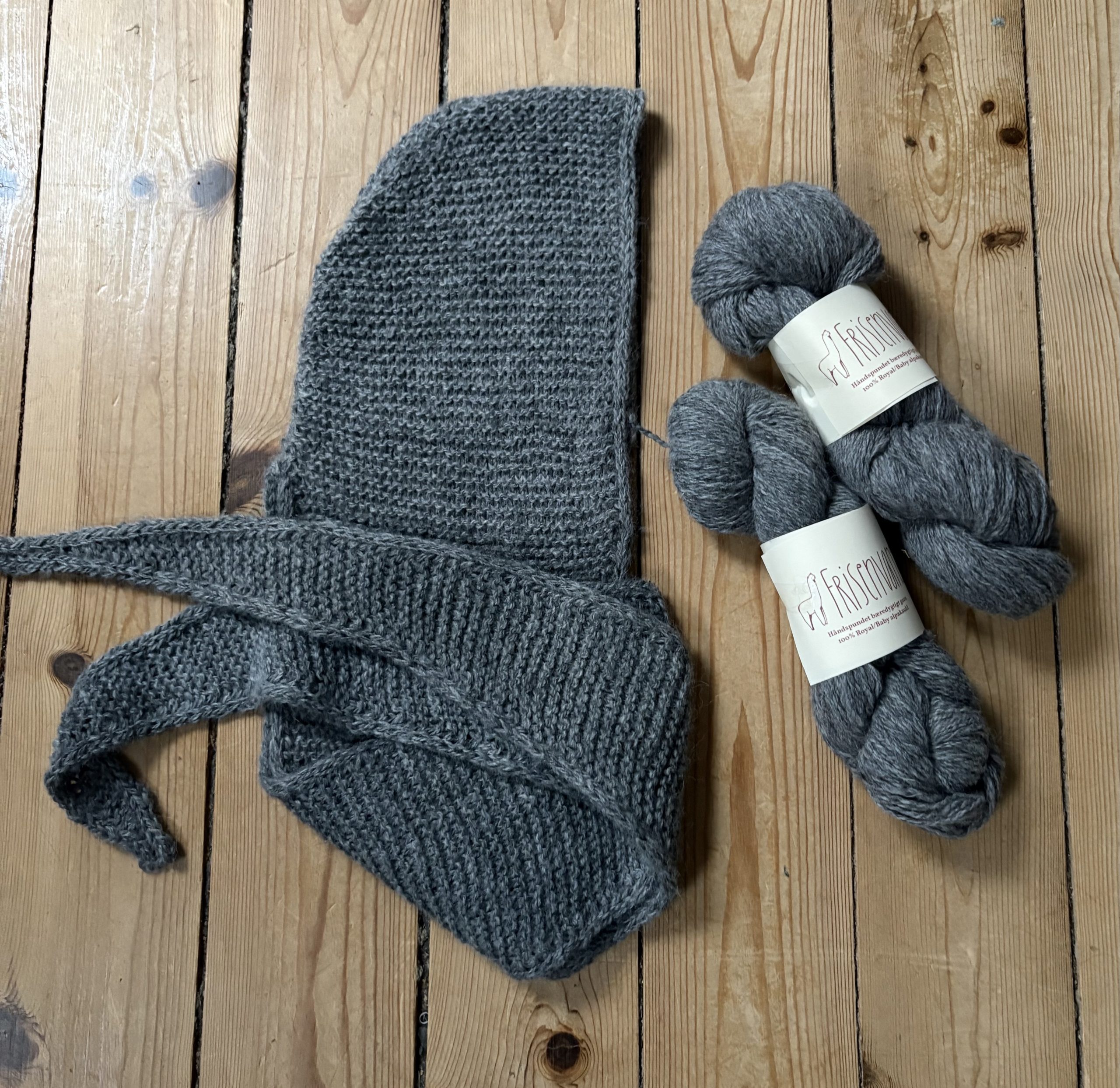 Sophie Hood strikkes frem og tilbage i ét stykke i retstrik med i-cordkanter fra spids til spids. Hætten formes med ind- og udtagninger, og den sys sammen med madrassting i nakken til sidst.